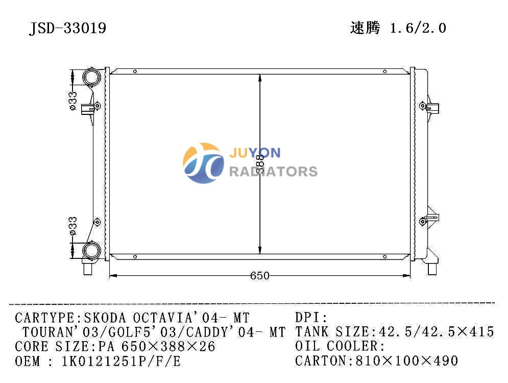 VOLKSWAGEN SKODA OCTAVIA'04-MT/TOURAN'03/GOLF5'03/CADDY'04-MT OEM 1K0121251P/F/E Radiator